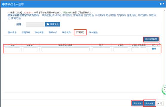 (2)修改“学习简历”、“家庭成员”:点击【增加学习简历】、【增加家庭成员】按钮后,输入相应的信息,点【提交申请】生效。若填写途中暂停,可点击【保存草稿】,暂不生效。