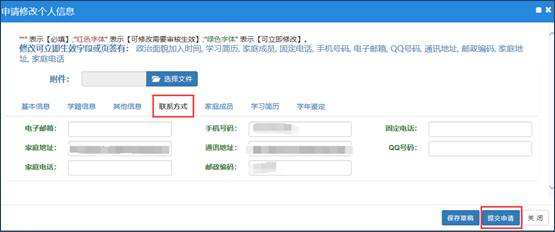(1)修改联系方式:在相应的框内填写正确信息,点【提交申请】后生效。