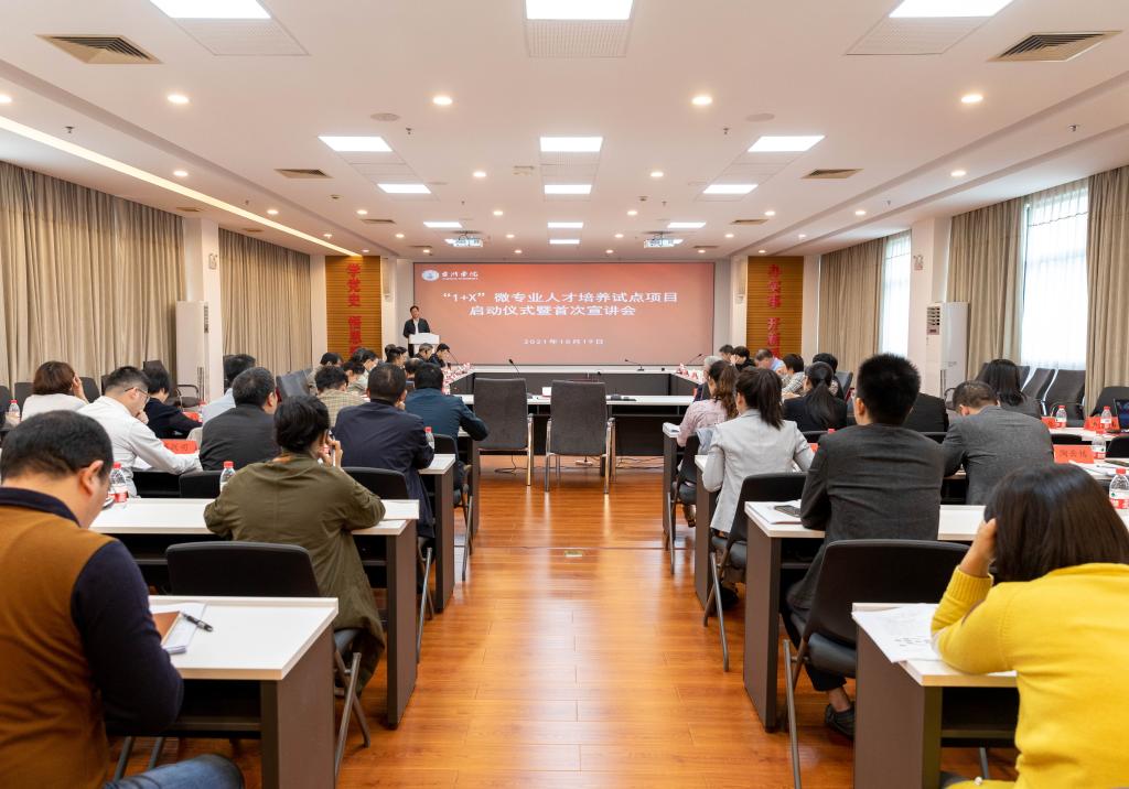 10月19日,学校在行政楼四楼会议室召开“1+X”微专业人才培养试点项目启动仪式暨首次宣讲会。校长陈光亭出席并讲话,副校长李钧敏主持。会议邀请省高等教育学会秘书长、省高等教育评价研究院执行院长施建祥教授作现场指导。四个微专业负责人作了宣讲。相关职能部门、各二级学院负责人、教学督导代表、骨干教师参加会议。