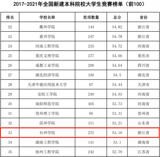 今年,我校在2017-2021年全国新建本科院校大学生竞赛榜单中以272项获奖总数,53.16总分排名第33位,比上一轮滚动榜单提升48名;并在2017-2021年全国普通高校大学生竞赛榜单排名298名,首次进入前300。