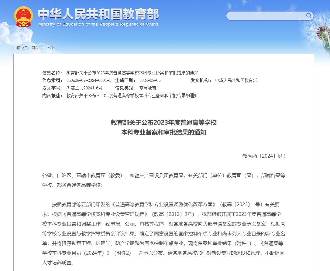 近日,《教育部关于公布2023年度普通高等学校本科专业备案和审批结果的通知》(教高函〔2024〕6号)公布,我校申报的网络空间安全(080911TK)本科专业获教育部审批设置。