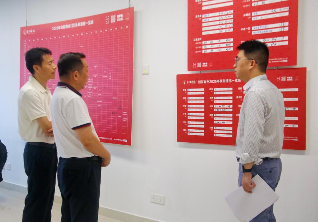 在本科招生录取现场,学校领导认真听取了教务处(招生办公室)关于近期学校全国各省(区)相关类型、批次的招生录取工作的汇报,详细询问了学校今年招生录取整体安排、当前进度进展,实地察看了录取通知书分装与邮寄工作,并慰问了暑期留校在岗师生,深入了解他们的学习生活情况。慰问期间,学校领导对下一阶段做好相关工作提出要求。招生工作,事关教育公平和社会期盼。学校各单位要一丝不苟做好录取工作,要做到招生录取有章可循、过程规范、数据准确,确保工作万无一失;要优化服务做好招生服务,在录取通知书寄送上用心用情,在招生热线咨询上耐心细致;要努力提升招生信息化水平,通过完善制度,建立校内平台,持续强化招生录取数据的运用和监管。