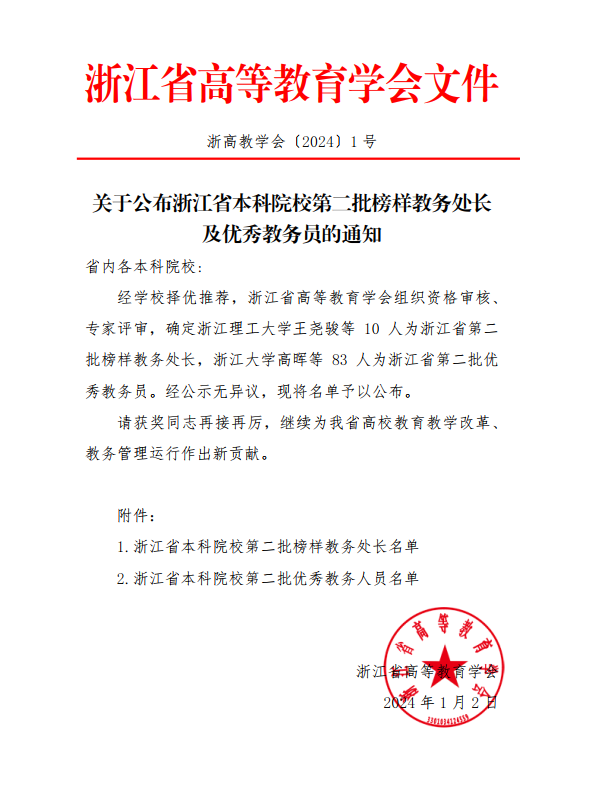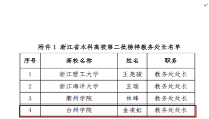 日前,浙江省高等教育学会印发《公布浙江省本科院校第二批榜样教务处长及优秀教务员的通知》(浙高教学会{2024}1号),我校教务处处长金凌虹获“榜样教务处长”称号、许锋和朱晓菊两位老师获“优秀教务员”称号。