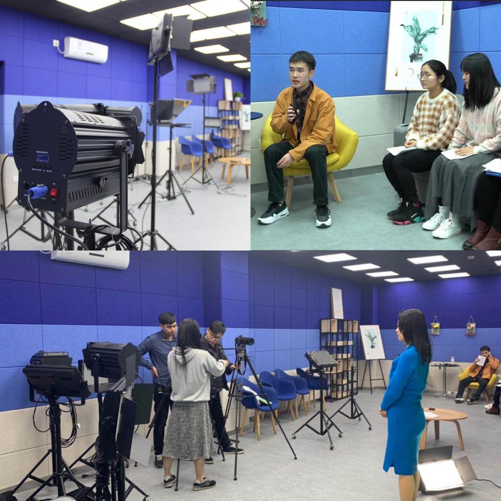 原“心湖交流吧”经过升级改造之后完成了华丽变身,其中最重要的改变在于与超星集团合作打造了可以进行线上课程拍摄的专业摄影棚。摄影棚耗资十余万,拥有隔音墙、布景、灯光、电脑、提词器、摄影机等高端设备,并有专业团队全程提供线上课程的准备、拍摄、制作、运行等服务。