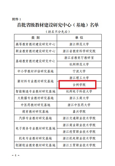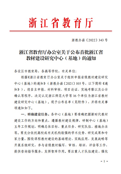 近日,浙教办函〔2022〕343 号公布了首批浙江省教材建设研究中心(基地)名单,我校医药化工学院金燕仙教授团队申报的“新材料专业教材研究基地”获批认定。全省共16家单位获首批浙江省教材建设研究中心(基地),其中本科院校9所。