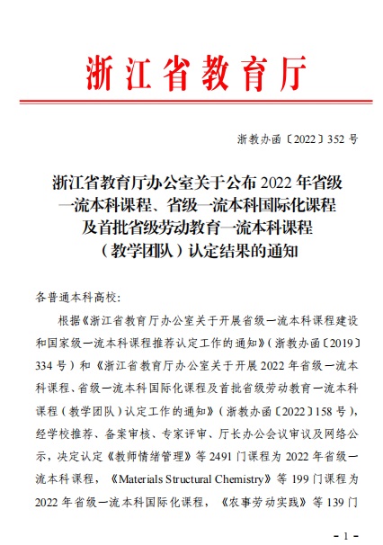 近日,浙江省教育厅发布了《2022年省级一流本科课程、省级一流本科国际化课程及首批省级劳动教育一流本科课程(教学团队)认定结果》(浙教办函〔2022〕352 号),我校共有67门课程获得省级一流课程认定,认定率为98.5%。其中线上一流本科课程19门,线下一流本科课程10门,线上线下混合式一流本科课程25门,社会实践一流本科课程8门,一流本科国际化课程2门,劳动教育一流本科课程3门。