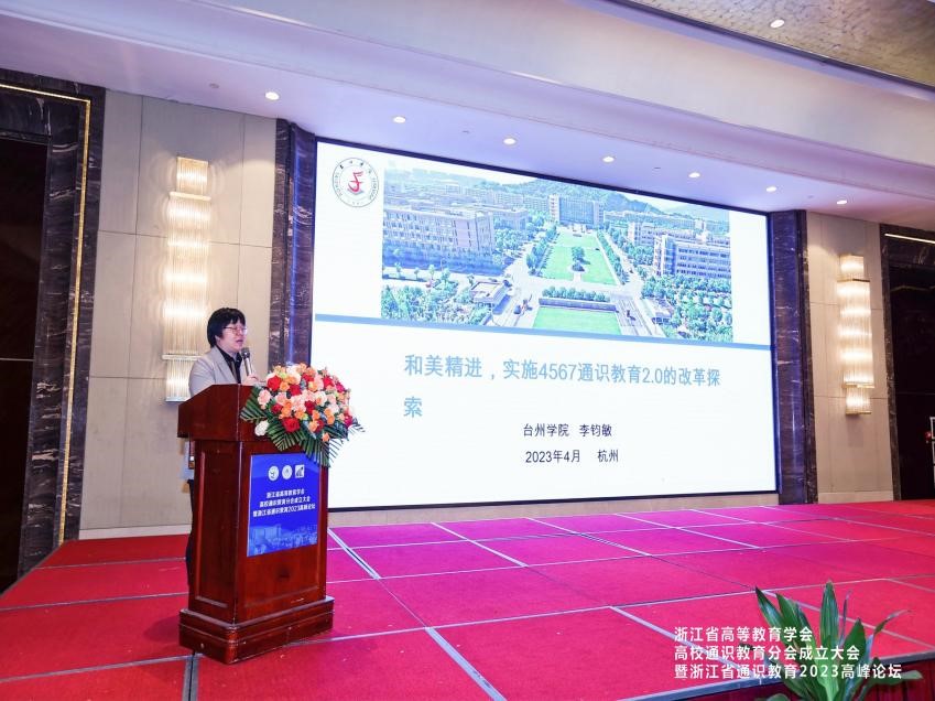 在大会交流中,李钧敏副校长代表学校通识教育中心作了题为《和美精进,实施4567通识教育2.0的改革探索》的发言。她从台州学院通识教育改革背景讲起,介绍了我校通识教育的开展情况,阐述了学校以“和美精进”培养理念,从通识教育体系重构、课程建设、空间拓展、管理优化、质量提升等维度构建“五位一体”改革实施路径,重点解读了“4567”通识教育2.0的改革内涵及改革成效,即“4”个通识课程体系、“5”个综合素养模块、“6”个通识教育空间、“7”个通识教育分中心,并介绍了以学生自我管理、自我发展为主体的一站式数字化通识教育服务平台。