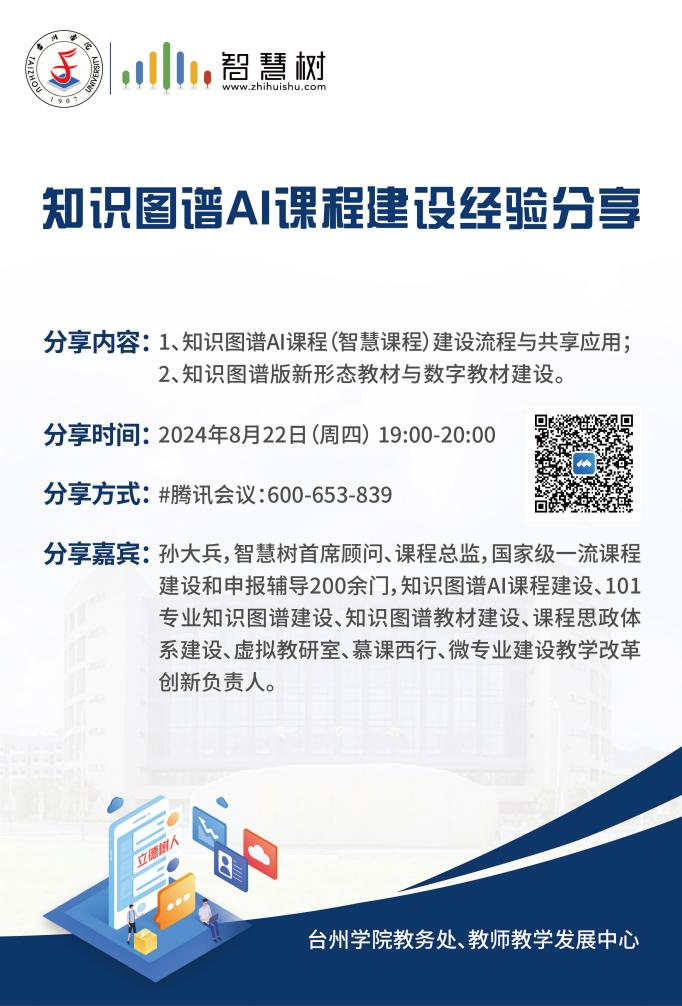 为落实国家教育数字化战略行动,推动人工智能赋能教学,促进数智课程建设,2024年8月22日晚,教务处邀请智慧树首席顾问、课程总监孙大兵做《知识图谱AI课程(智慧课程)建设与应用》专题培训与交流,共四十余名教师参加线上交流。
