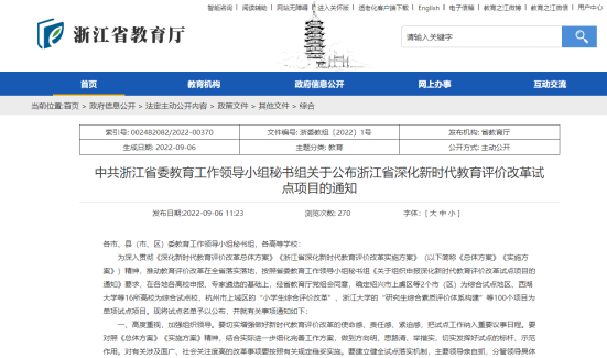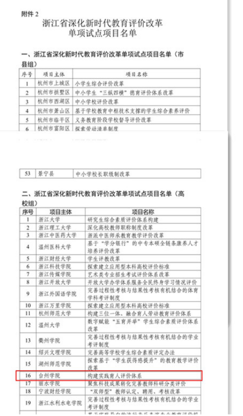近日,中共浙江省委教育工作领导小组秘书组公布了浙江省深化新时代教育评价改革试点项目,我校申报的《构建实践育人评价体系》项目成功获批高校组单项试点项目。全省单项试点项目共立项100项,其中本科高校立项24项。