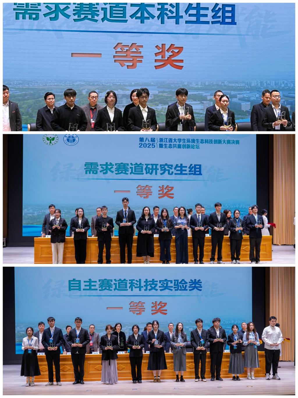2025年11月16日,第八届浙江省大学生环境生态科技创新大赛暨生态共富创新论坛在衢州学院落幕。我校学子凭借扎实的专业功底、创新的技术方案与突出的实践能力脱颖而出,斩获一等奖3项、二等奖6项、三等奖6项,获奖数量和获奖率均创历史新高,稳居省内同等高校前列,用青春力量为生态文明建设赋能。