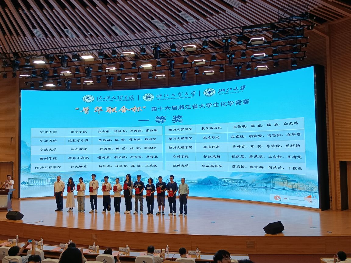2025年8月23日- 25日,第十六届浙江省大学生化学竞在绍兴文理学院圆满落幕。本届赛事聚焦化学学科核心素养与实践创新能力,设置“创新研究项目”“化学知识测试”“实践能力考核”“现场答辩”四大环节,赛程紧凑且挑战性强,吸引全省多所高校优秀团队同台竞技。我校医药化工学院学子凭借扎实的理论根基、出色的动手能力、卓越的创新思维与沉稳的答辩表现脱颖而出,最终斩获一等奖 1 项、二等奖 2 项、三等奖 2 项,用实力为学校赢得荣誉!