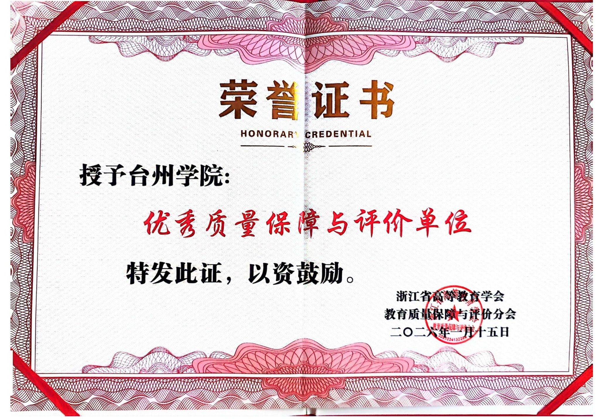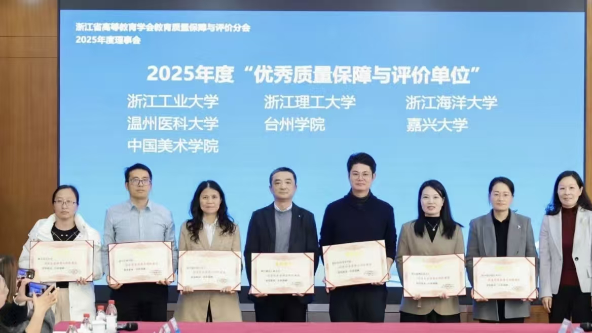 1月15日,浙江省高等教育学会教育质量保障与评价分会召开工作年会,会议集中评选和表彰了优秀单位与先进典型。台州学院教育督导与教学评估中心获评“浙江省普通高校优秀质量保障与评价单位”,教务处蒋胜韬副处长参加会议并现场领奖。